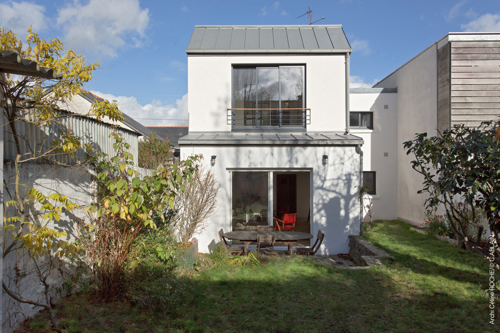 L’ensemble est habillé d’un enduit clair sur isolation extérieure, tandis que la couverture et le bardage en zinc ton quartz unifient le volume dans une teinte douce et lumineuse.