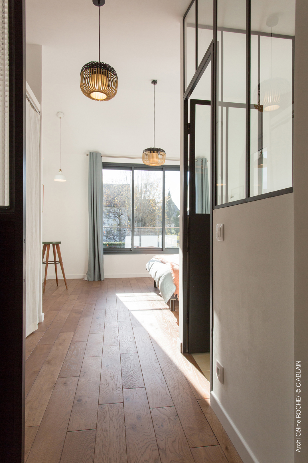 Roche Morel Atelier d’Architecture a ainsi imaginé une surélévation légère et élégante, posée au-dessus du séjour existant, comme une cabine suspendue entre ciel et jardin.