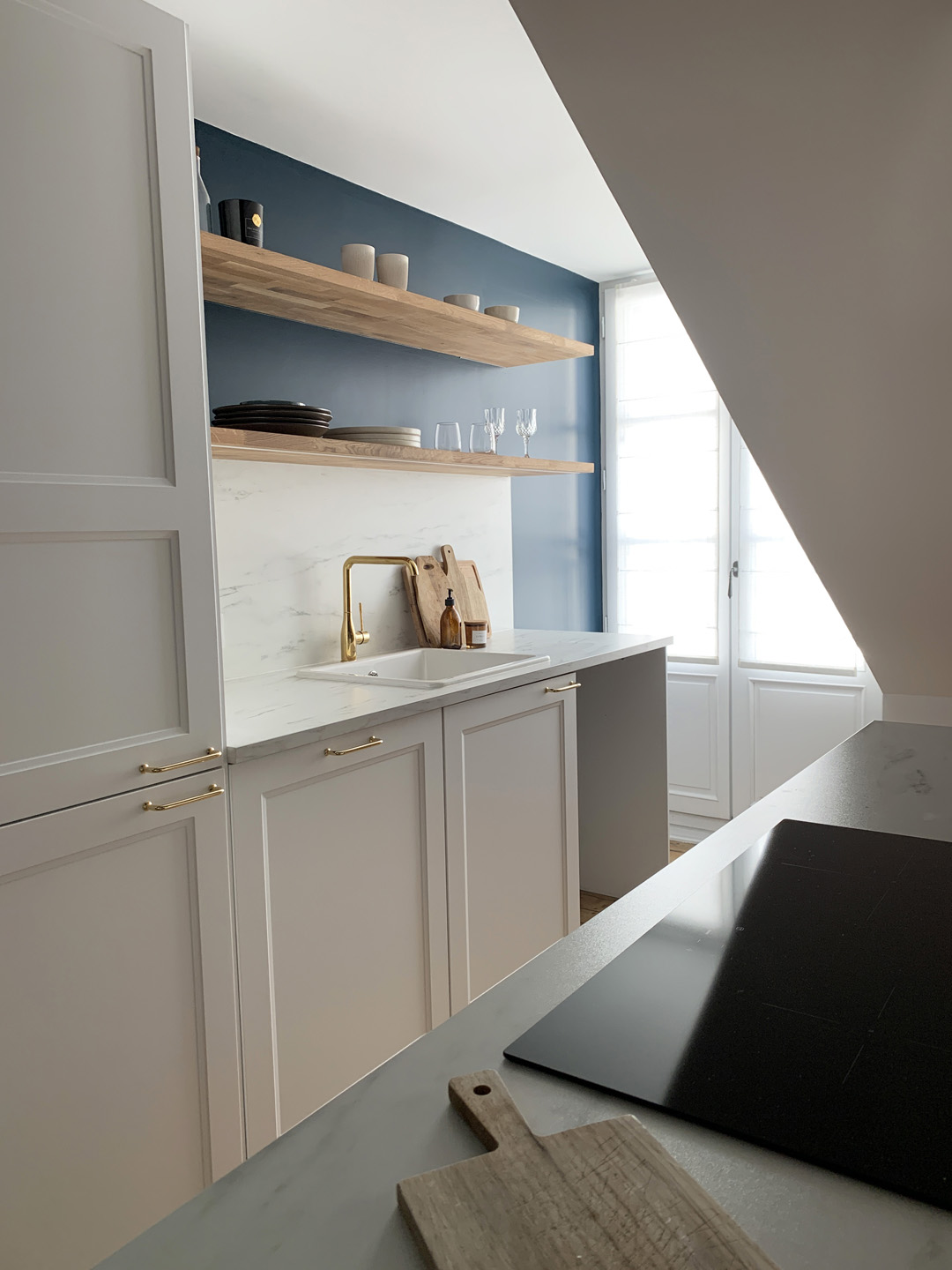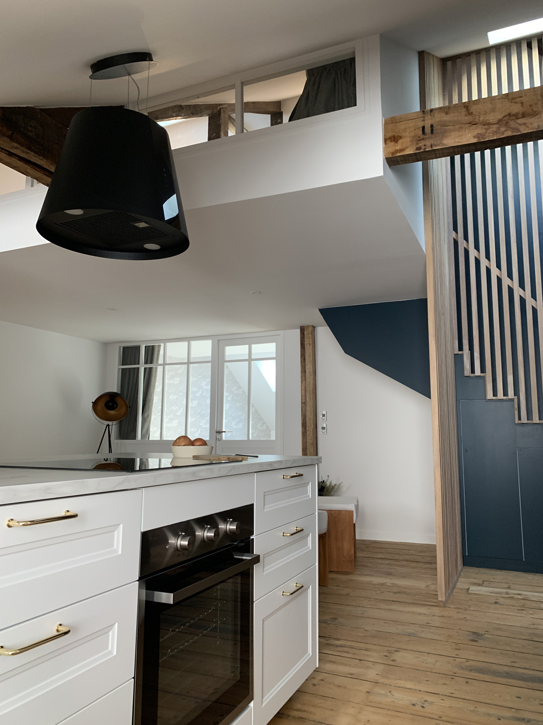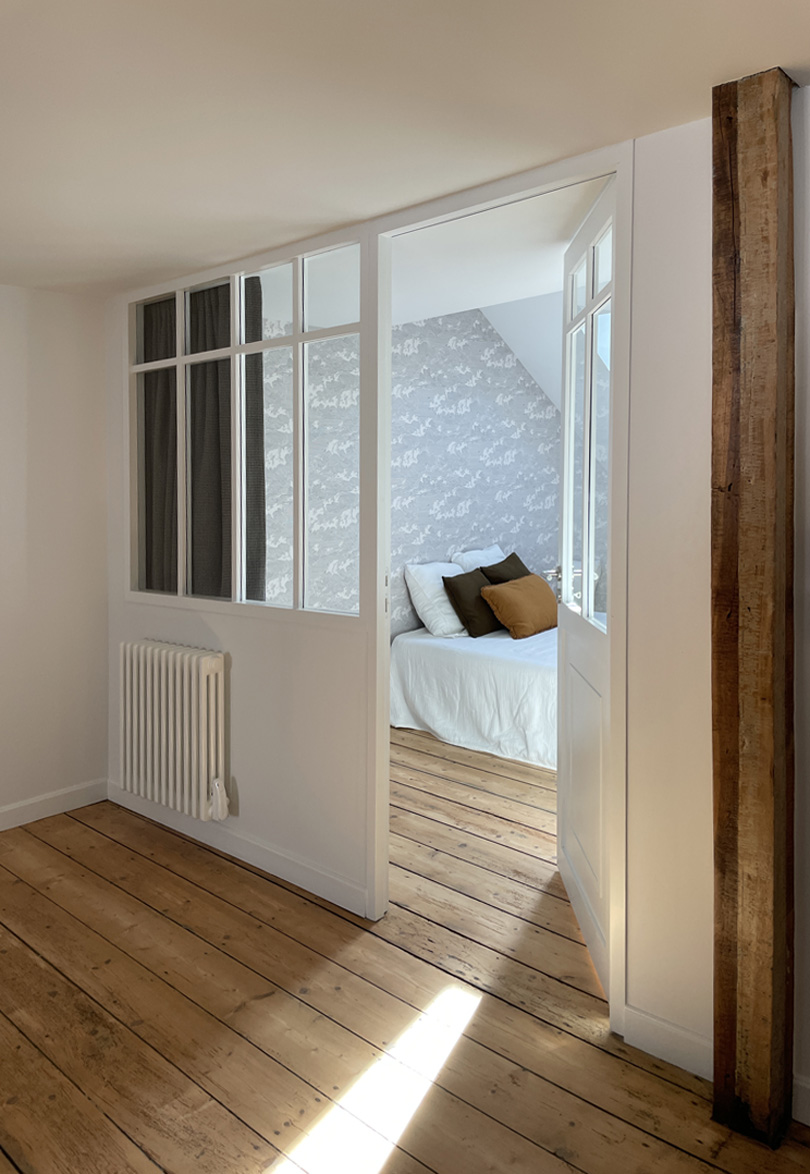 L’agencement optimisé et les matériaux choisis – bois, verrière blanche, sols souples – insufflent chaleur et élégance tout en respectant l’esprit du lieu.