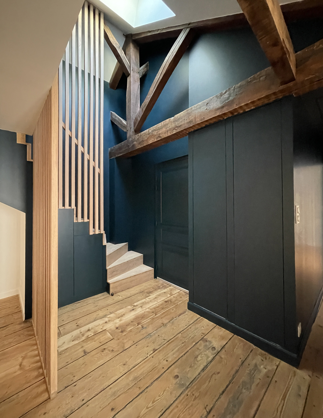L’intervention s’appuie sur une analyse fine de l’existant, avec le souhait de révéler la beauté d’origine tout en adaptant les volumes aux usages d’aujourd’hui.