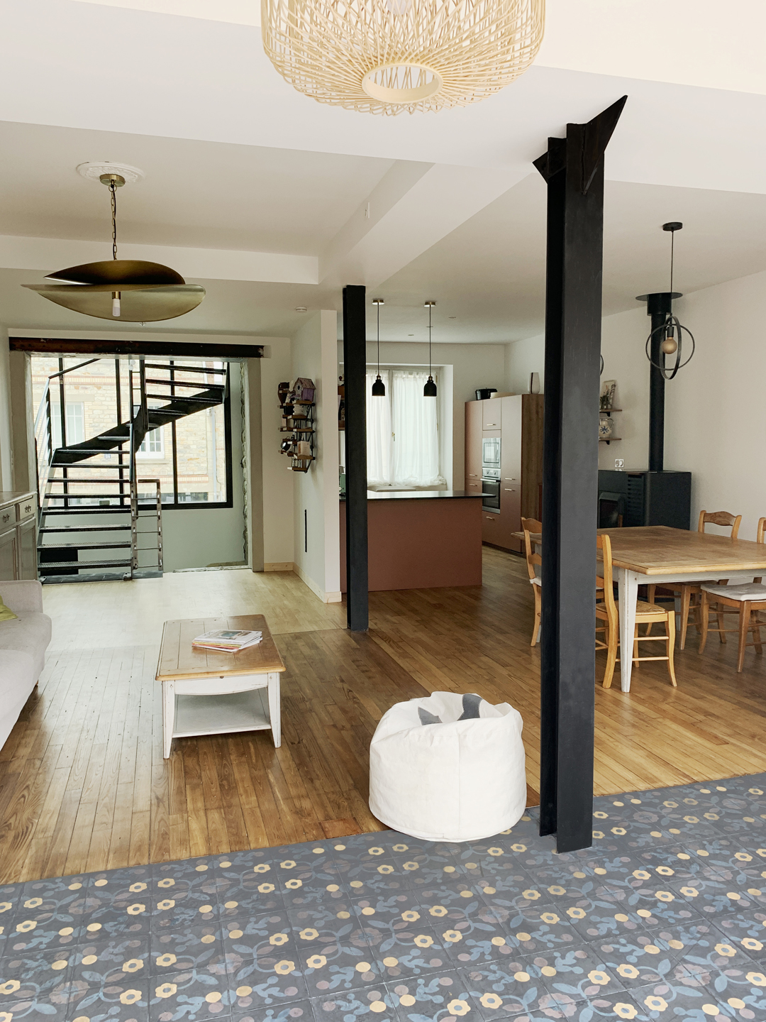 À l’intérieur, le parquet contrecollé en chêne, les carreaux de ciment et les teintes douces unifient les espaces rénovés.