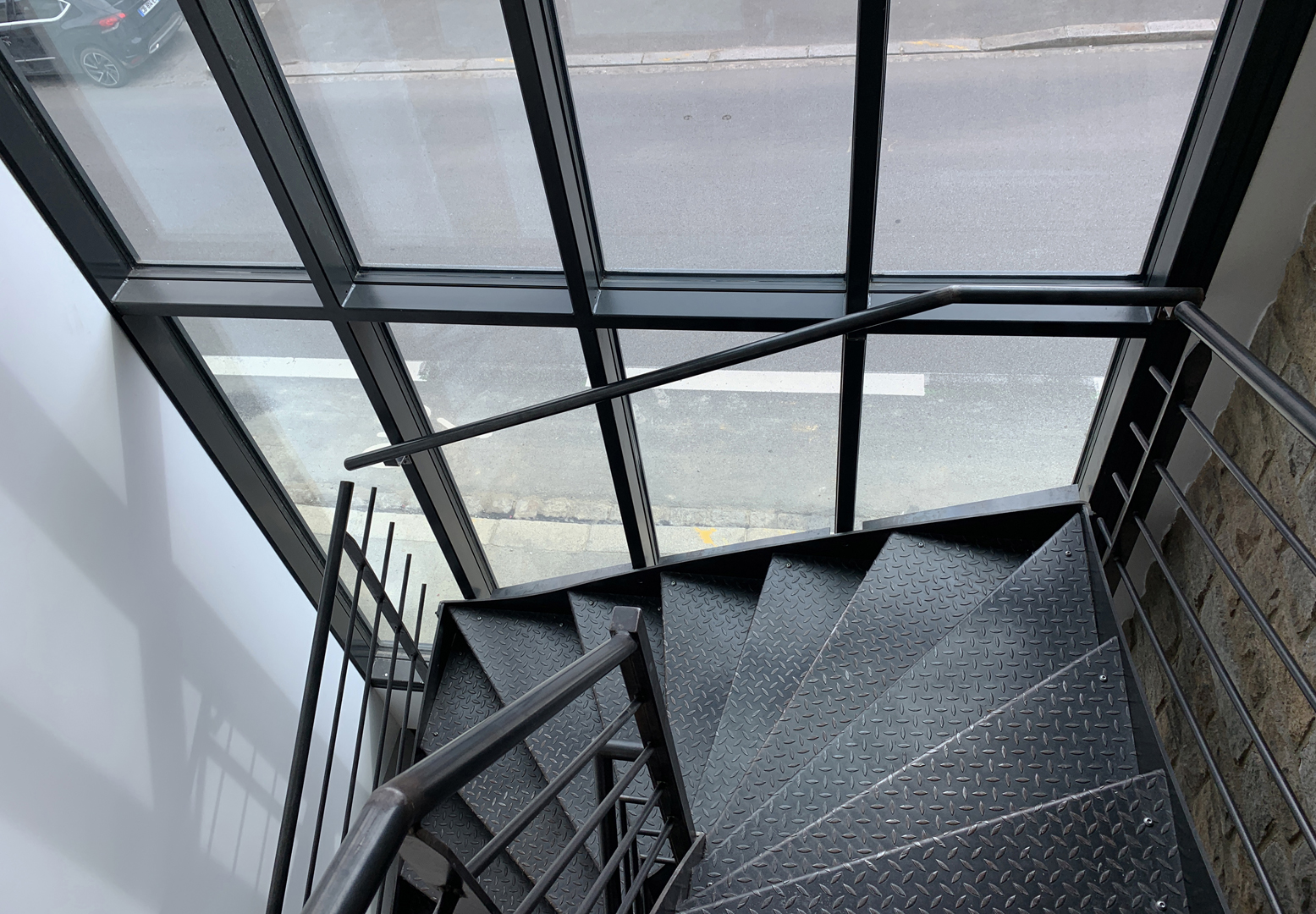 L’intégration d’un escalier en métal noir, logé dans ce nouveau volume, libère les pièces existantes et fluidifie les déplacements.