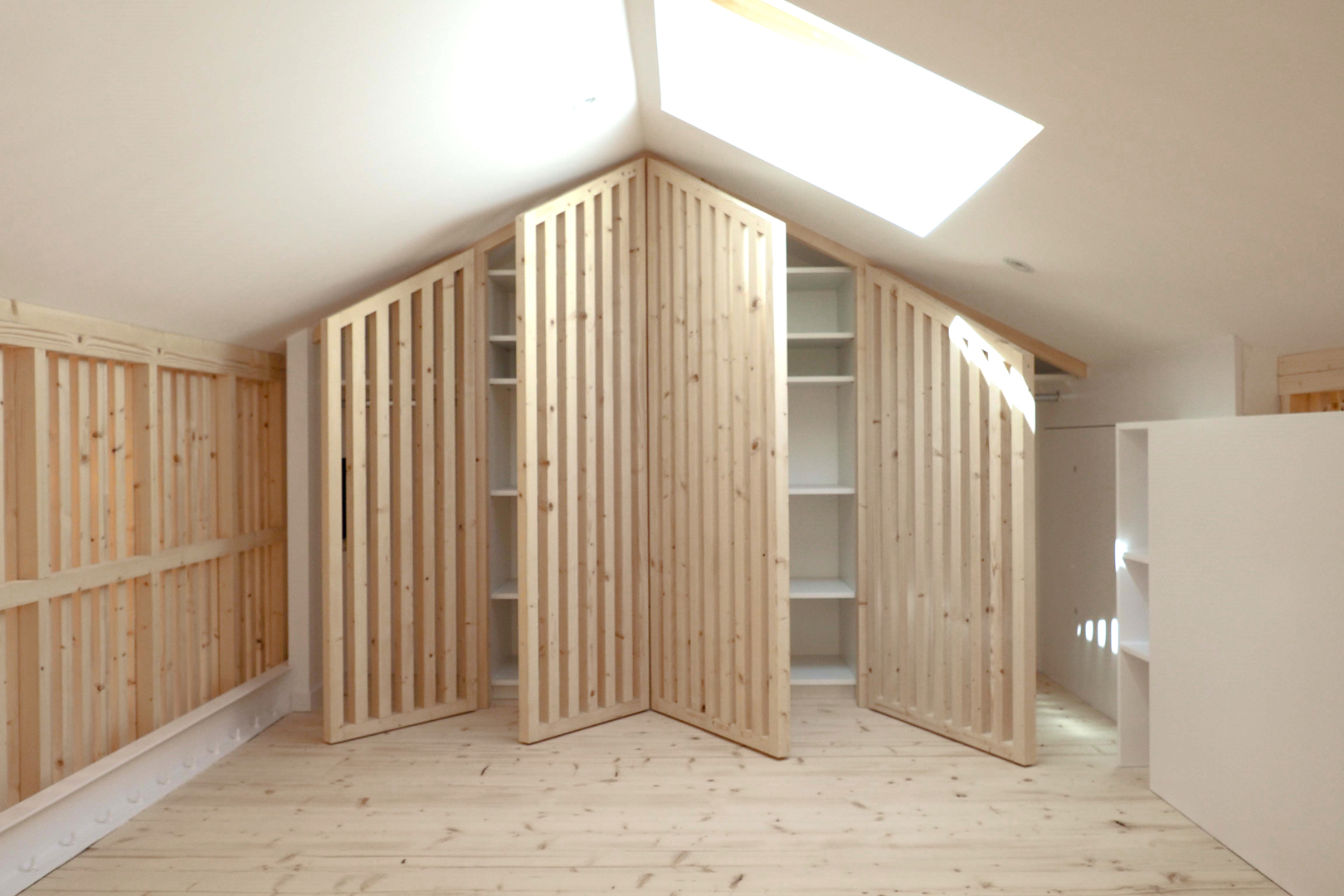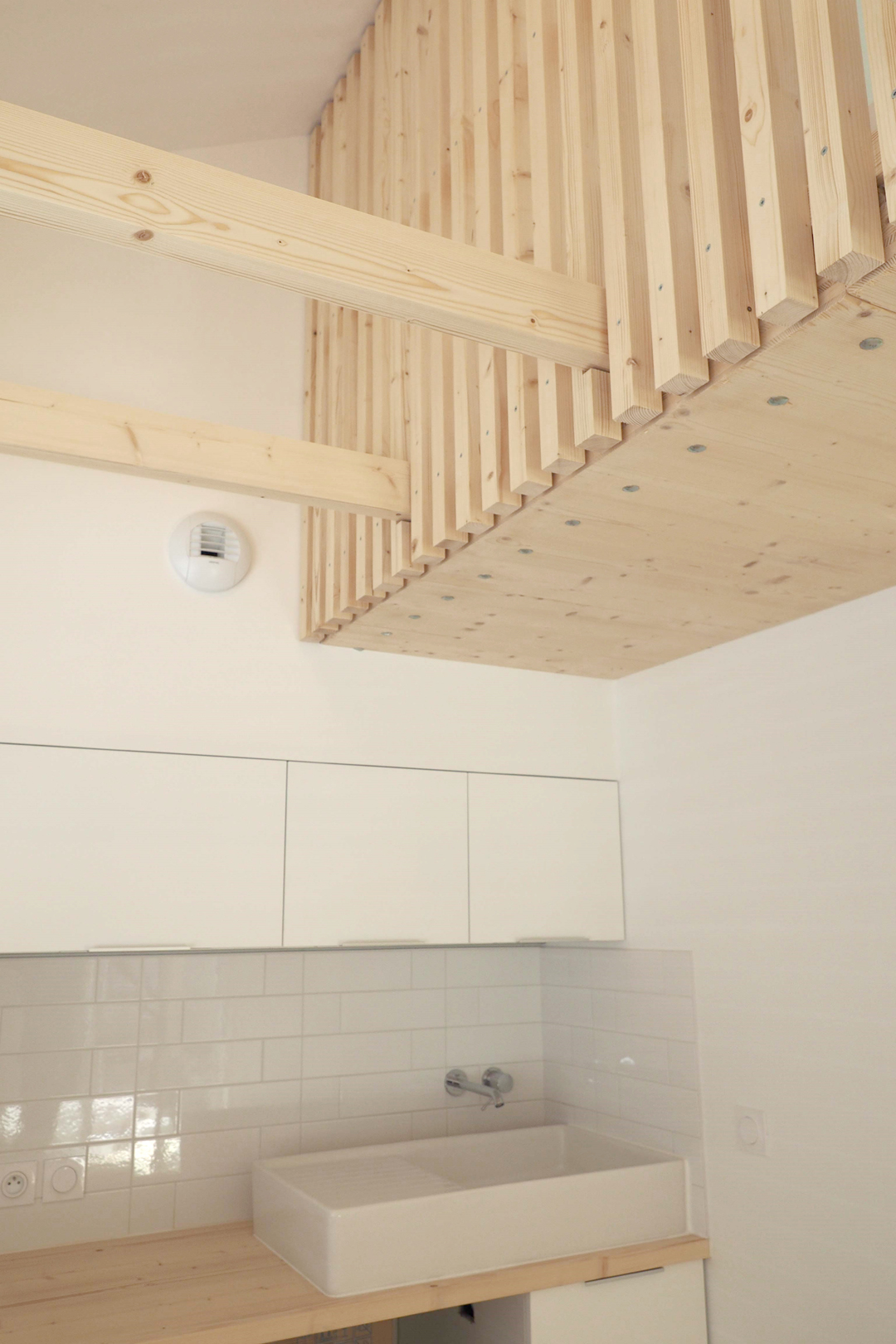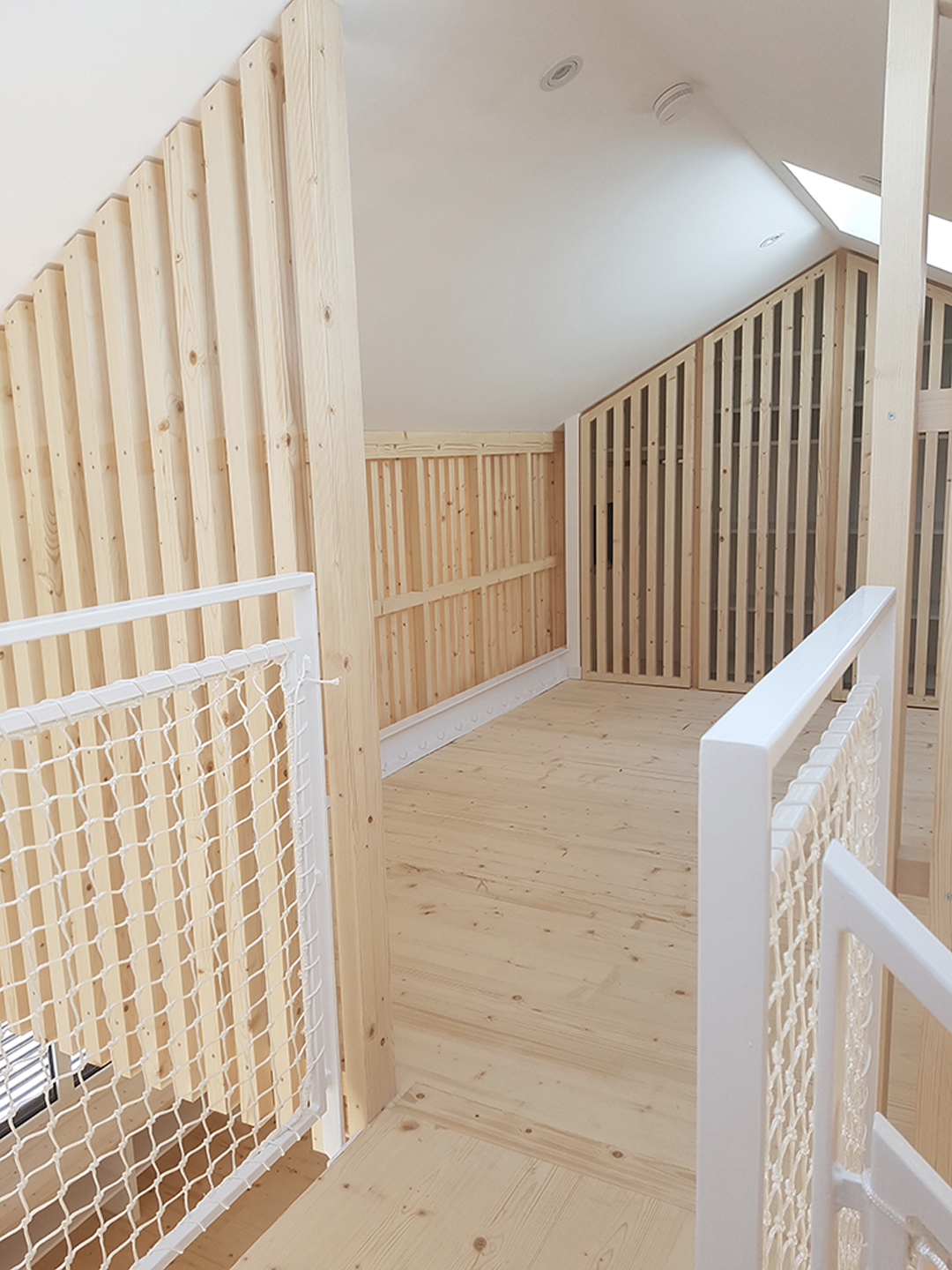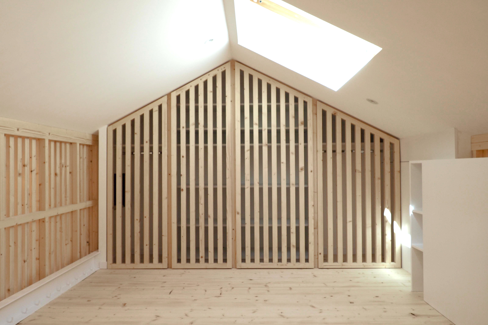 Escalier, claustra et dalle porteuse ont été réalisés dans la même essence d’épicéa, assurant une continuité visuelle forte.