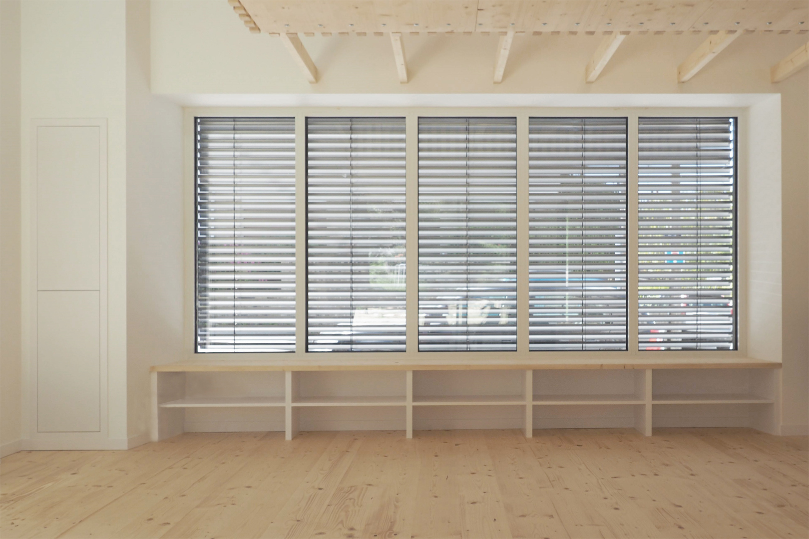 Les lamelles verticales en bois permettent d’ajuster l’éclairement selon les heures du jour, garantissant un confort lumineux et thermique optimal.